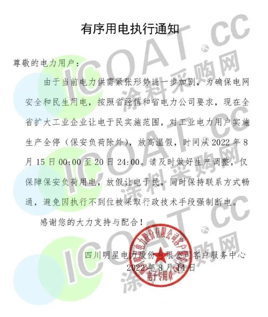 四川明星電力發布《有序用電執行通知》,按照省經信和省電力公司要求,現在全省擴大工業企業讓電于民實施范圍,對工業電力用戶實施生產全停(保安負荷除外),放高溫假,時間從2022年8月15日00:00至20日24:00。