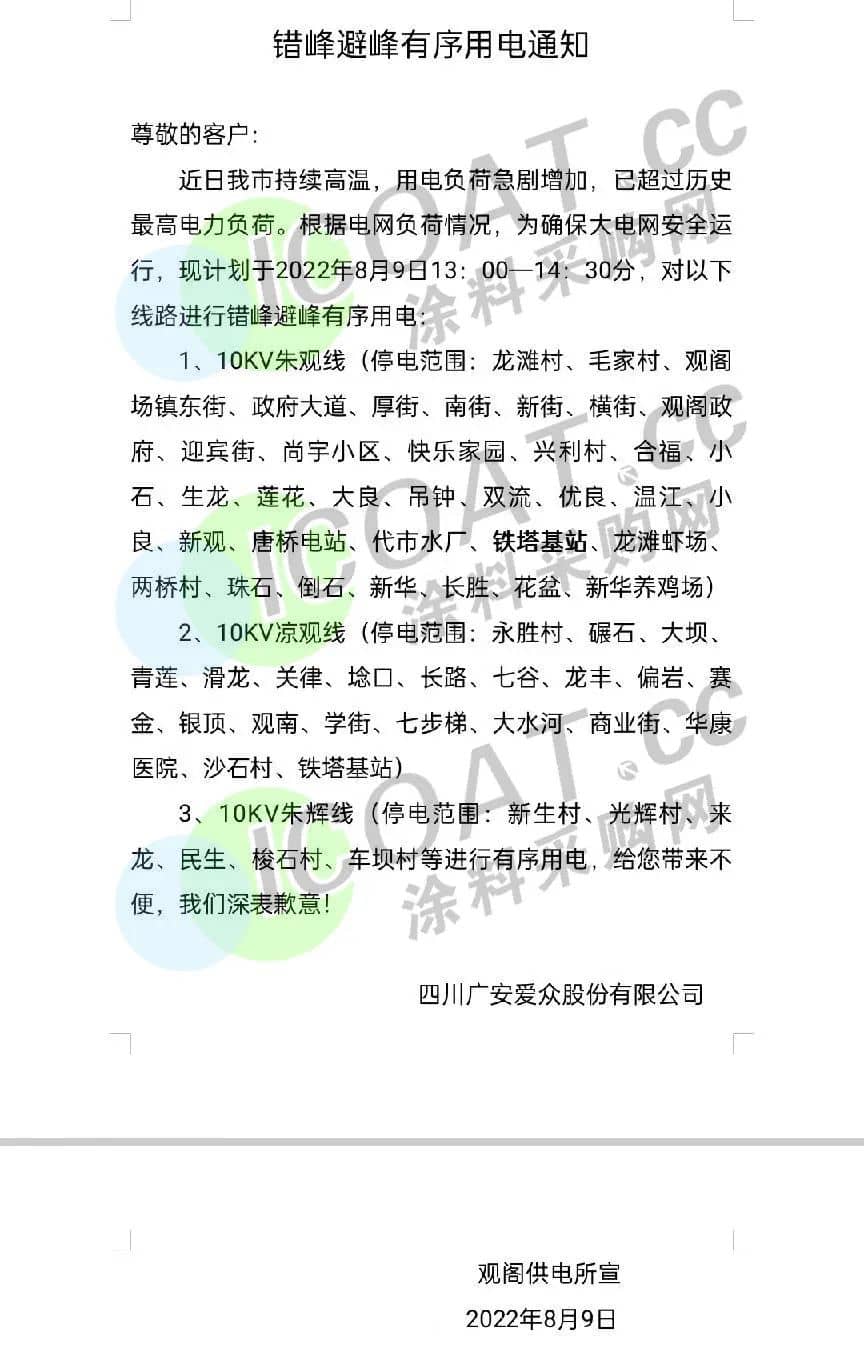 四川廣安愛眾股份觀閣供電所發布《錯峰避峰有序用電通知》,現計劃于2022年8月8日13∶00-14∶30分,對部分線路進行錯峰避峰有序用電,另一部分進行有序用電。