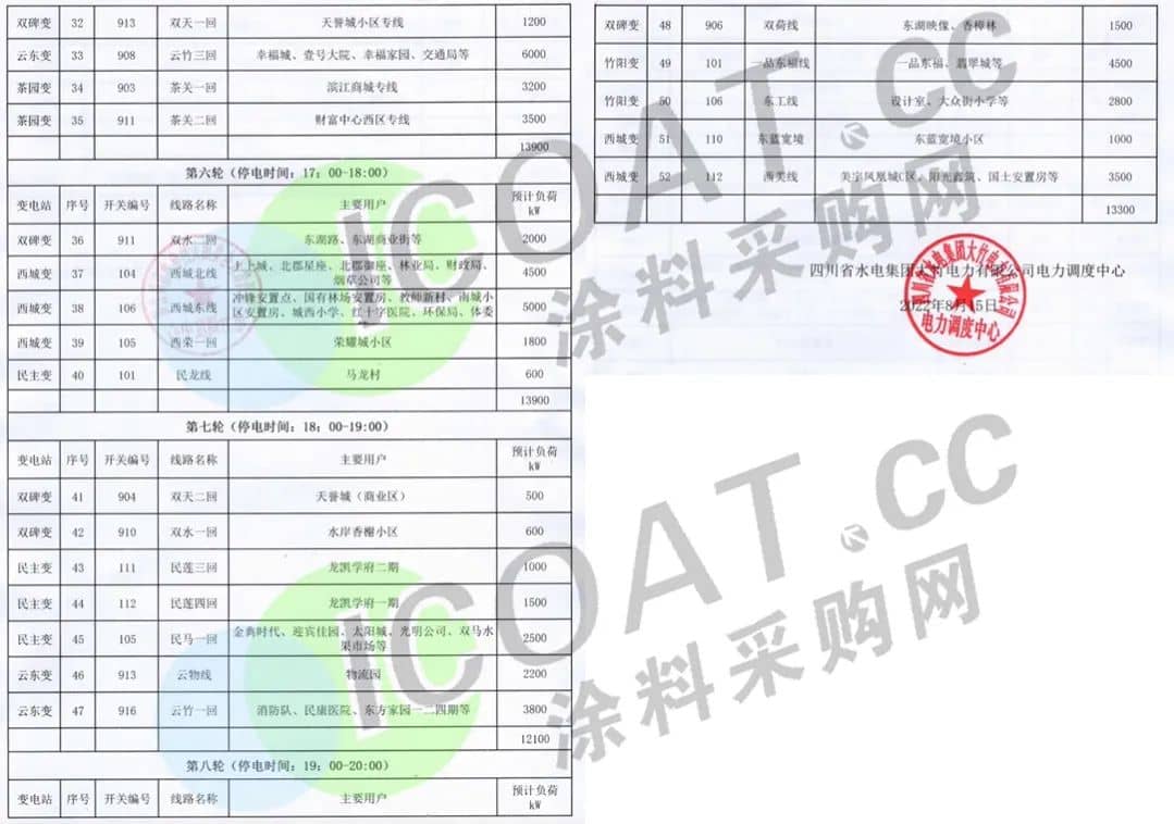 四川省水電集團大竹電力發布迎峰度夏城區居民用電線路緊急限電序位表,要求16日各變電站按時間段進行八輪限電,時間從11點到20點,每個輪次停電1小時。