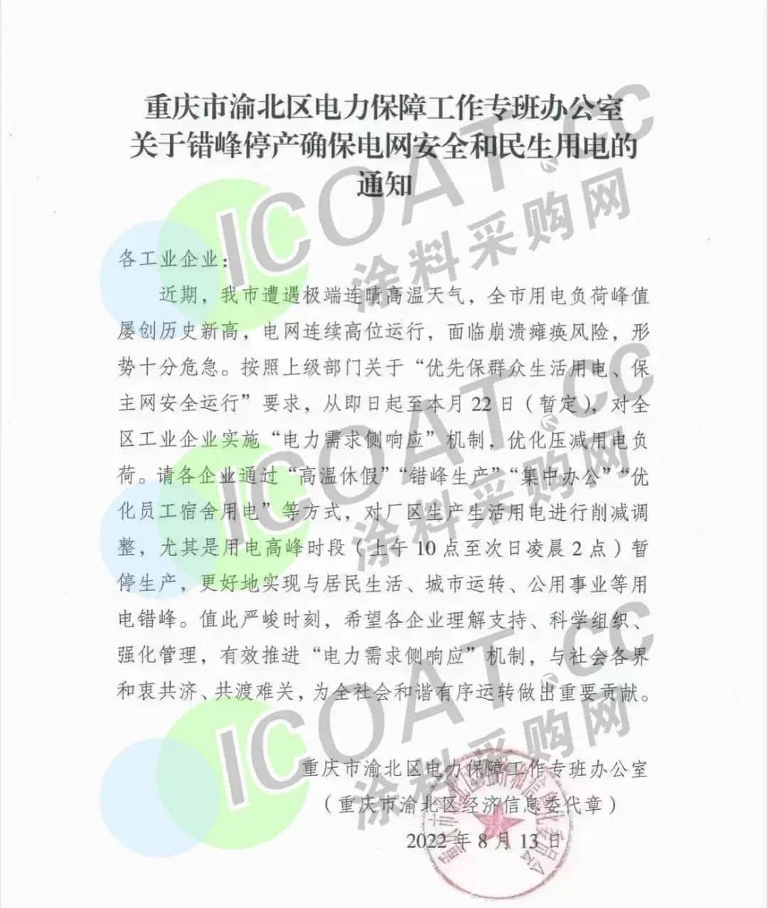 重慶市渝北區發布《關于錯峰停產確保電網安全和民生用電的通知》,從即日起至本月22日(暫定),對全區工業企業實施“電力需求側響應”機制。請各企業通過“高溫休假”、“錯峰生產”、“集中辦公”、“優化員工宿舍用電”等方式,對廠區生產生活用電進行削減調整,尤其是用電高峰時段(上午10點至次日凌晨2點)暫停生產,更好地實現與居民生活、城市運轉、公用事業等用電錯峰。
