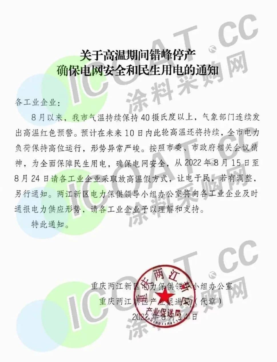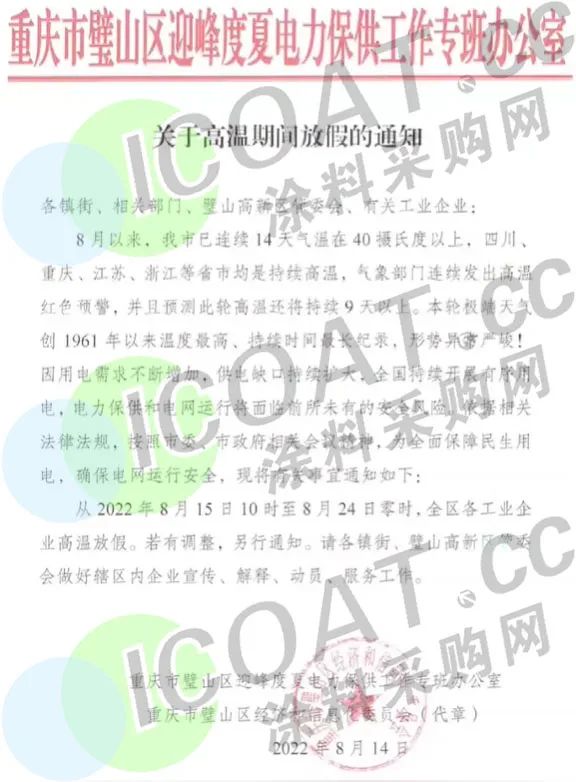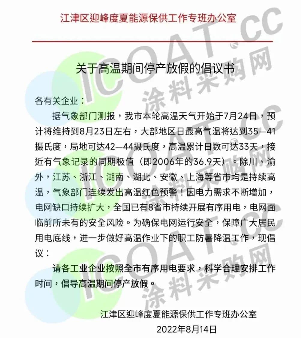重慶兩江新區《關于高溫期間錯峰停產確保電網安全和民生用電的通知》稱,從2022年8月15日至8月24日請各工業企業采取放高溫假方式,讓電于民。