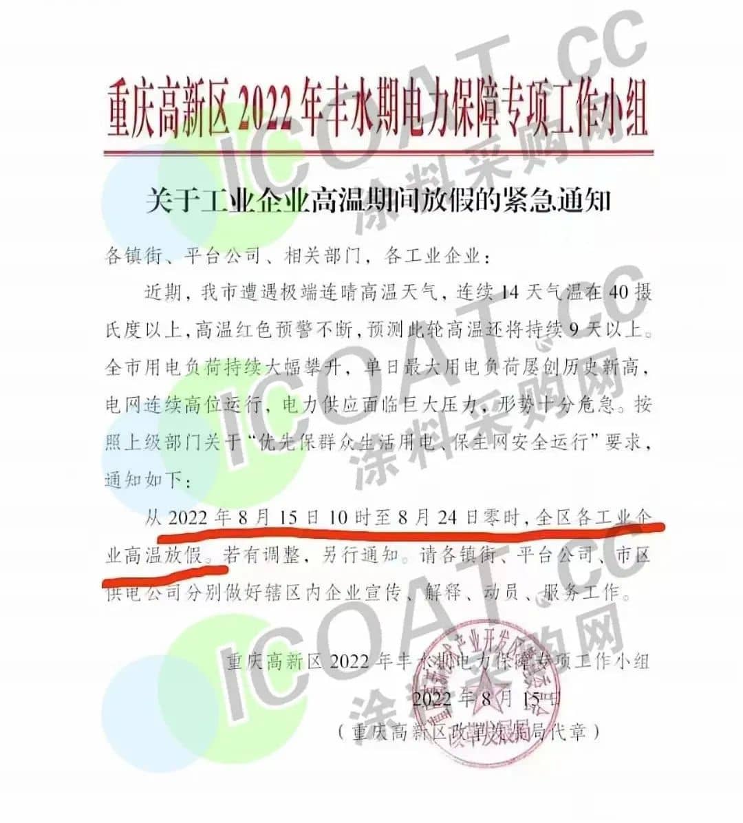 重慶高新區發布《關于工業企業高溫期間放假的緊急通知》稱,從2022年8月15日10時至8月24日零時,全區各工業企業高溫放假。若有調整,另行通知。