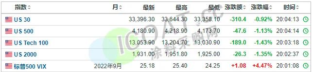 截至當地時間8月22日收盤,道指跌643.13點,跌幅為1.91%,報33063.61點,創6月16日來最大單日跌幅和兩周低位;標普500指數跌90.49點,跌幅為2.14%,也創6月16日以來最大單日跌幅,報4137.99點,至兩周新低。納斯達克100指數收跌2.66%,創6月28日來最大跌幅。