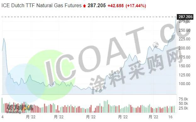 俄氣公司宣布將于8月31日至9月2日暫停通過北溪1號管道的天然氣供應,引發了市場的恐慌情緒,荷蘭TTF天然氣9月合約價格連續第三天創出歷史新高,合約價格報287.2歐元/兆瓦時,較上周五收盤價上漲了17.44%。創年初俄烏沖突以來的新高。盤中曾漲超20%至295歐元,也創52周新高。