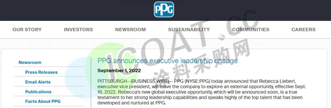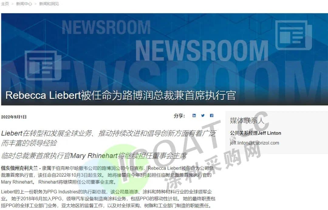 PPG執行副總裁Rebecca Liebert將于9月16日離開公司,與此同時,路博潤特種化學公告,Rebecca Liebert被任命為公司總裁兼首席執行官,該任命自10月3日起生效。而在此前,Liebert曾在石化企業霍尼韋爾UOP擔任總裁兼首席執行官,以及在雷諾食品包裝擔任總裁職務。