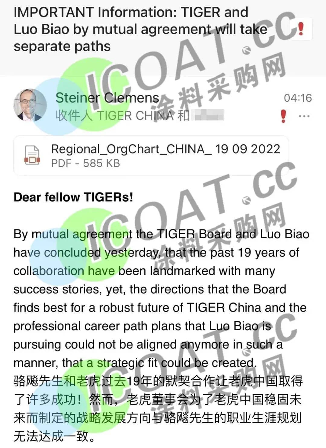 據涂料采購網消息,2022年9月19日,老虎新材料總部發布一份名為《IMPORTANT information:TIGER and Luo Biao by mutual agreement will take seperate paths》的內部郵件稱:老虎董事會認為老虎中國發展戰略與駱飚先生的職業規劃無法達成一致,駱飚先生將離開老虎新材料,Philipp Bulgarini 將擔任首席執行官。