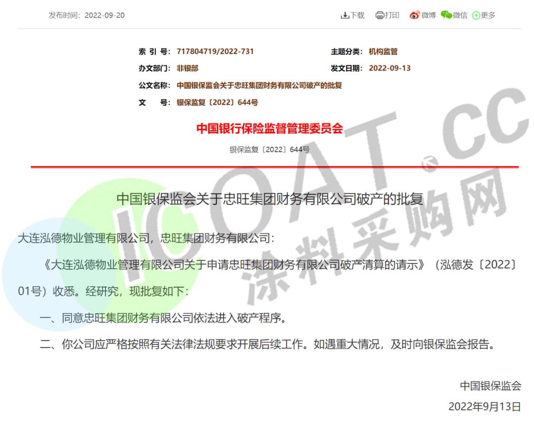 與此同時,中國銀保監會官網發布消息,同意忠旺集團財務有限公司依法進入破產程序。千億資產規模的“亞洲鋁王”忠旺集團自曝陷入流動性危機,在引戰、債務重組均未有下文情況下,忠旺集團的子公司,為其提供貨幣金融服務的忠旺財務先一步走向破產清算。
