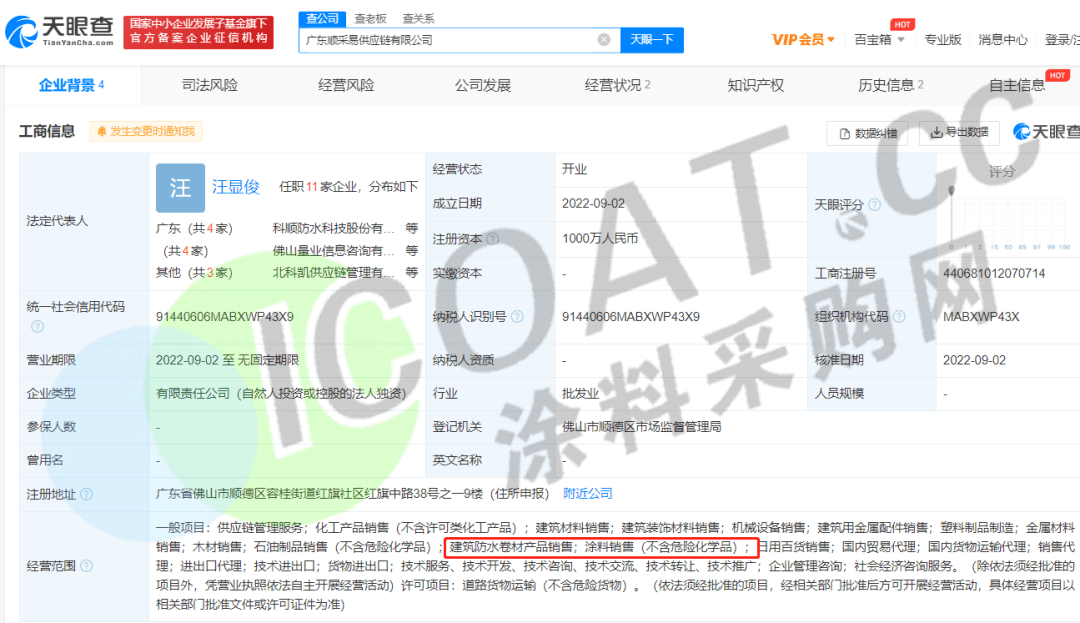 近日,防水行業龍頭科順股份在廣東成立了廣東順采易供應鏈有限公司,該企業注冊資本1000萬元,由科順股份100%控股。其經營范圍包括供應鏈管理服務、建筑材料銷售、建筑防水卷材產品銷售、涂料銷售(不含危險化學品)等。