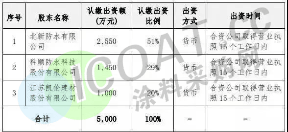 1年前,北新防水、科順股份和凱倫股份為了搶奪防水市場,聯手成立了供應鏈有限公司。其中,北新防水出資2550萬元,出資比例為51%;科順股份出資1450萬元,出資比例為29%;凱倫股份出資1000萬元,出資比例為20%。