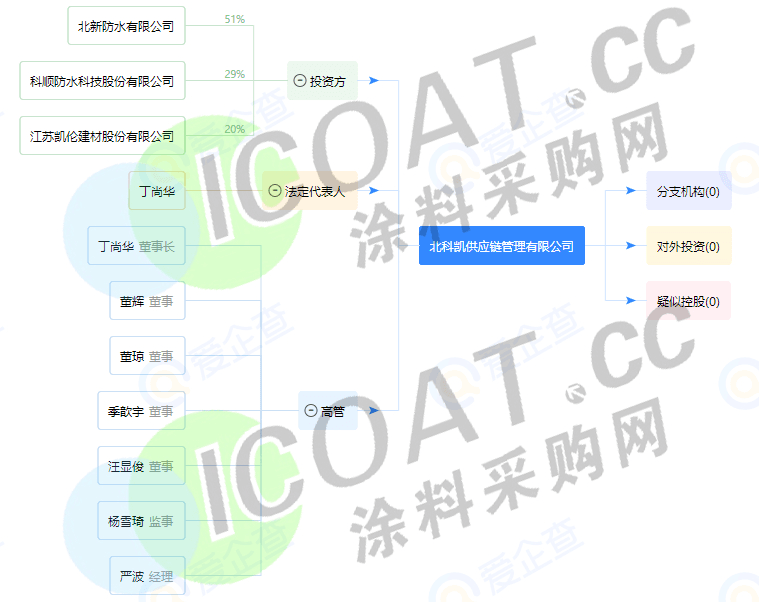 涂料采購網查閱發現,北科凱供應鏈管理有限公司的法人丁尚華,同時也是北新新材料(錦州)有限公司法定代表人,并在北新防水有限公司擔任董事、經理,由此可以看出這三家公司的關聯密切。