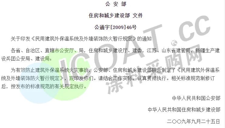 2009年9月,公安部在歷史上首次發(fā)布民用建筑外保溫防火問題的條文——46號文件《民用建筑外保溫系統(tǒng)及外墻裝飾防火暫行規(guī)定》,明確規(guī)定,民用建筑外保溫材料的燃燒性能不應(yīng)低于B2級。至此B3級保溫材料在建筑工程中被徹底廢除。