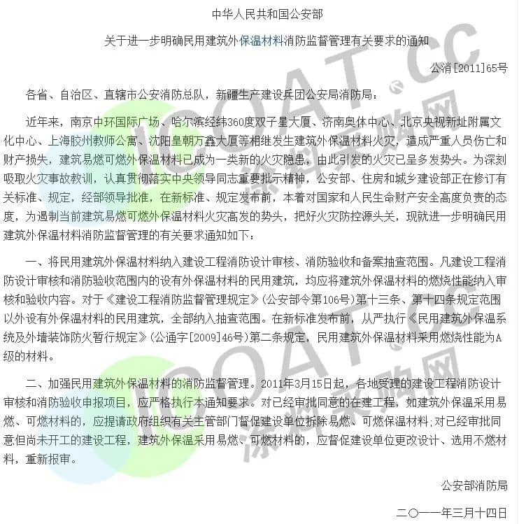 2011年3月,公安部下發(fā)公消65號文件《關(guān)于進(jìn)一步明確民用建筑外保溫材料消防監(jiān)督管理有關(guān)要求的通知》,規(guī)定從嚴(yán)執(zhí)行46號文件提出的外保溫材料燃燒性能應(yīng)為A級,并且把外保溫材料的燃燒性能納入消防審核的范圍,加強(qiáng)施工過程中的消防管理。