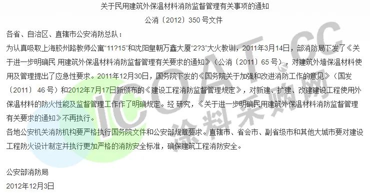 2012年12月3日,公安部消防局下發(fā)《關(guān)于民用建筑外保溫材料消防監(jiān)督管理有關(guān)事項(xiàng)的通知》(350號文件),決定取消執(zhí)行65號文件。但國家層面對保溫材料的生產(chǎn)和使用,一直都維持著比較嚴(yán)格的標(biāo)準(zhǔn)。