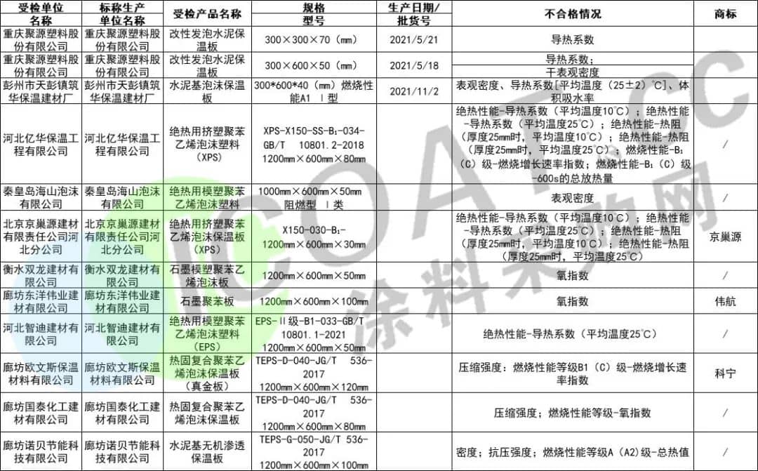 除此之外,保溫材料行業(yè)以次充好、質(zhì)量不合格的情況也是切實(shí)存在的。據(jù)全國多地市場監(jiān)管部門數(shù)據(jù),今年以來保溫材料市場質(zhì)量不合格的情況較多,且不合格情況涉及導(dǎo)熱系數(shù)、絕熱性能、壓縮強(qiáng)度、燃燒性能登記、密度等等。