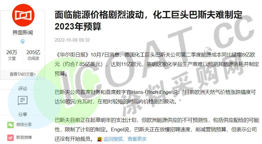 德國化工巨頭巴斯夫公司表示,第二季度能源成本同比猛增8億歐元,達到11億歐元,且難以預測其能源消耗并制定預算。巴斯夫正在放慢招聘速度,削減營銷預算。