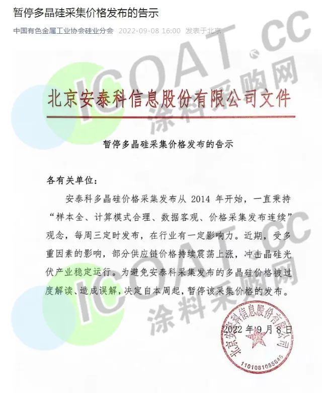 居高不下的硅料還“灼傷”了報價機構,中國有色金屬工業協會硅業分會近期宣布暫停已持續8年、每周三例行的多晶硅采集價格發布。