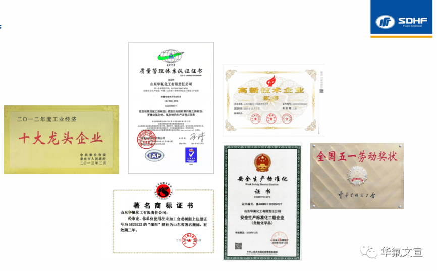 據了解,華氟化工的產品結構可分為三大系列:含氟聚合物、含氟精細化學品和無機氟化學品,主要產品包括聚四氟乙烯樹脂、乙烯-四氟乙烯共聚物、氟碳涂料樹脂、二氯四氟乙氧基苯胺、氫氟醚系列、全氟烷基醚磺酸鉀(F53-B)、氟化鈉等,通過了GB/T19001-2016等質量管理體系認證,并出口到全球10多個國家和地區,廣受客戶的一致好評。