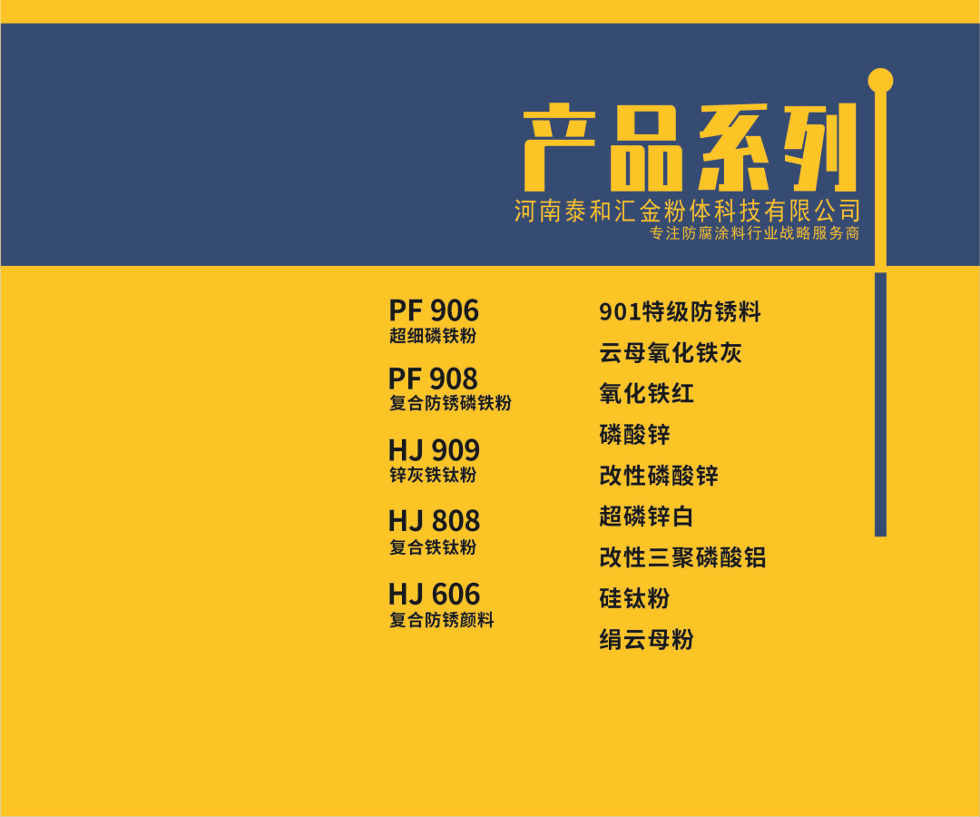 依托30年的品牌文化積淀,泰和匯金只做為客戶帶來價值的產品,產品體系涵蓋PF906超細磷鐵粉、PF908復合防銹磷鐵粉、HJ909鋅灰鐵鈦粉、HJ808復合鐵鈦粉、HJ606復合防銹顏料、901特級防銹料、云母氧化鐵灰、氧化鐵紅、磷酸鋅、改性磷酸鋅、超磷鋅白、改性三聚磷酸鋁、硅鈦粉、絹云母粉等。