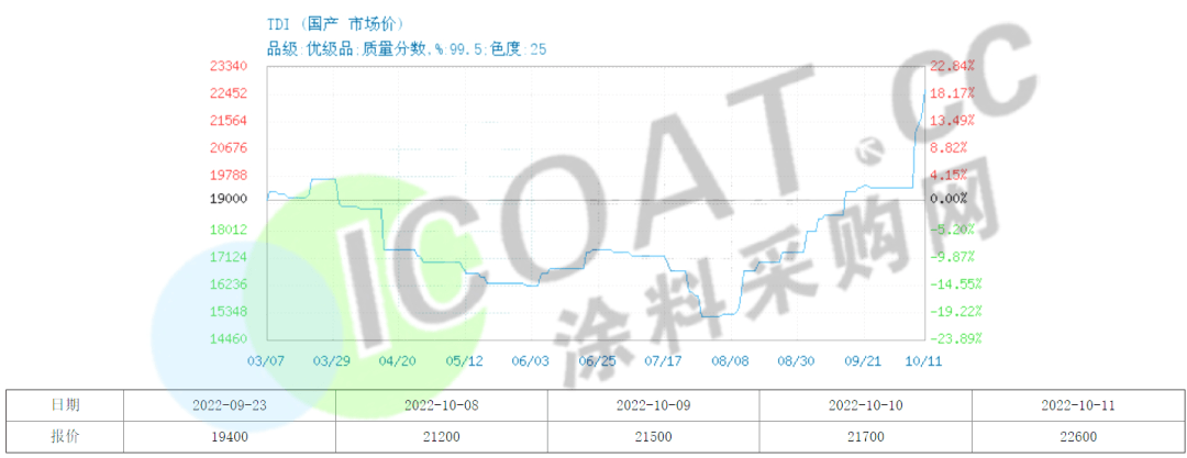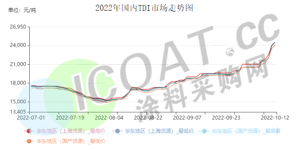 國慶節后,TDI價格五連漲達到24366元/噸,月內上漲超過21%。從8月初的15000元/噸上漲至今,TDI本輪上漲周期已經超過70天,漲幅超過60%,刷新近四年來新高。歐洲多套TDI裝置停車,國內開工率也進入年內低點,供應端的緊缺使得TDI漲勢依舊強勢。