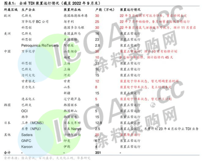 目前TDI全球名義產能351萬噸,檢修裝置或面臨檢修裝置產能達182萬噸,占全球TDI總產能的52.88%,也就是說近一半的裝置處于停產狀態,全球TDI面臨供給緊張格局。