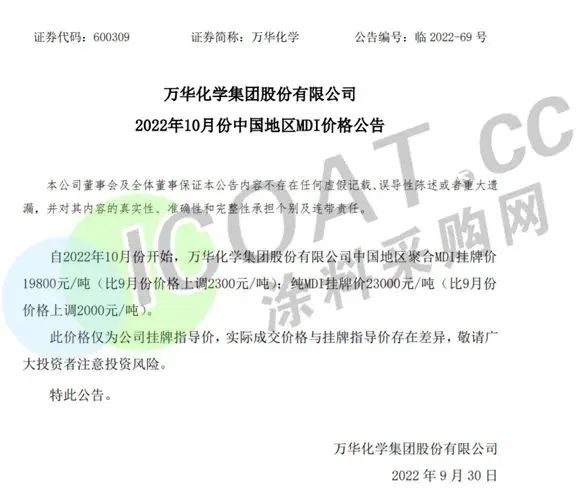 隨著冬季供暖的要求,MDI部分需求將在10月被釋放出來;國外方面,近期海外能源危機問題仍較為突出,利好MDI價格。陶氏歐洲或自9月1日起對歐洲市場MDI、聚醚和組合料產品進行漲價,上漲幅度為200歐元/噸(約合人民幣1368元人民幣/噸)。萬華化學自10月份開始,中國地區聚合MDI上調2300元/噸,純MDI上調2000元/噸。