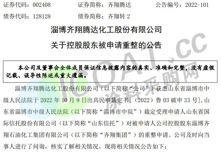 近日,化工上市公司齊翔騰達發(fā)布公告稱,山東省淄博市中級人民法院出具民事裁定書,裁定受理對被申請人公司控股股東淄博齊翔石油化工集團有限公司的重整申請。齊翔騰達表示,齊翔集團能否重整成功存在不確定性,是否導致公司控制權變動也存在不確定性。