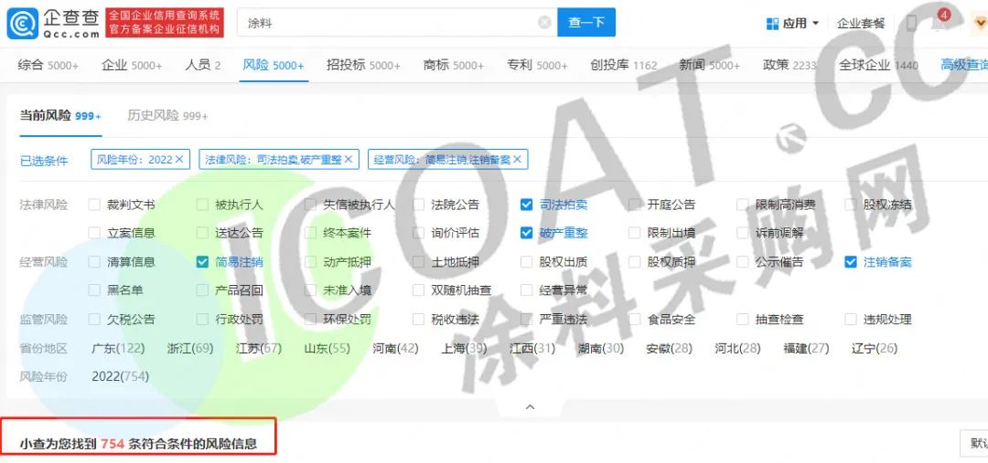企查查平臺數(shù)據(jù)顯示,2022年年初以來,涂料企業(yè)(含涂料制造、銷售等名稱中包括“涂料”關鍵詞的企業(yè))出現(xiàn)破產重整、注銷拍賣等風險的企業(yè)超過700家,覆蓋了上海、廣東、江蘇、重慶、廣西、福建等多個省市地區(qū)。