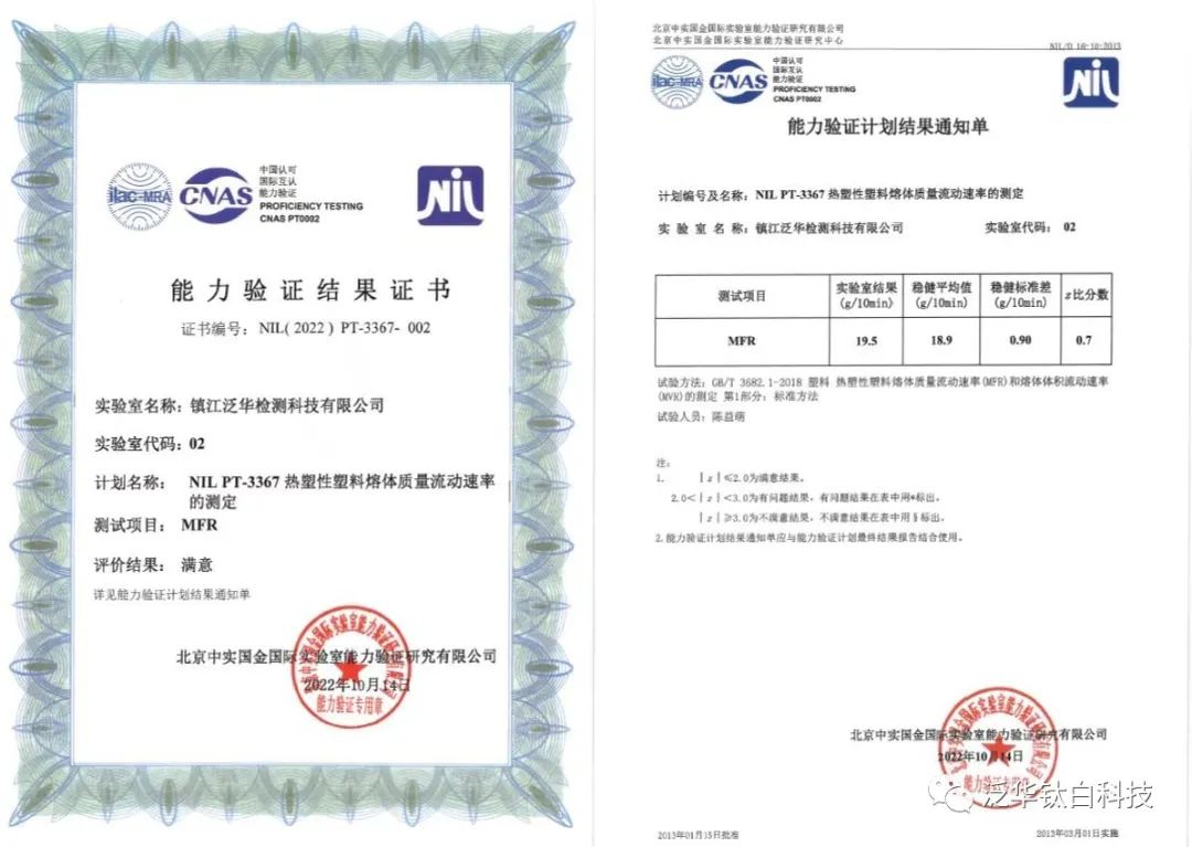 近日,江蘇泛華化學科技有限公司下屬鎮江泛華檢測科技有限公司通過了由國家認證認可監督管理委員會組織、北京中實國金國際實驗室能力驗證研究有限公司實施的本年度NIL(2022)PT-3367-002“熱塑性塑料熔體質量流動速率的測定”能力驗證,順利獲得“能力驗證滿意證書”。