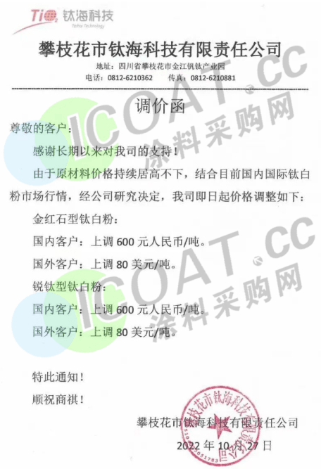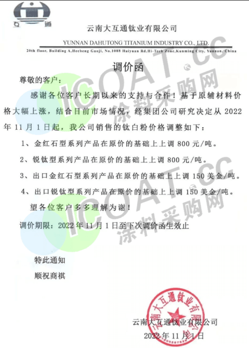 近日,云南大互通鈦業有限公司發布調價函,稱自11月1日起,金紅石型、銳鈦型鈦白粉在原價的基礎上上調800元/噸,出口產品價格在原價基礎上上調150美元/噸。