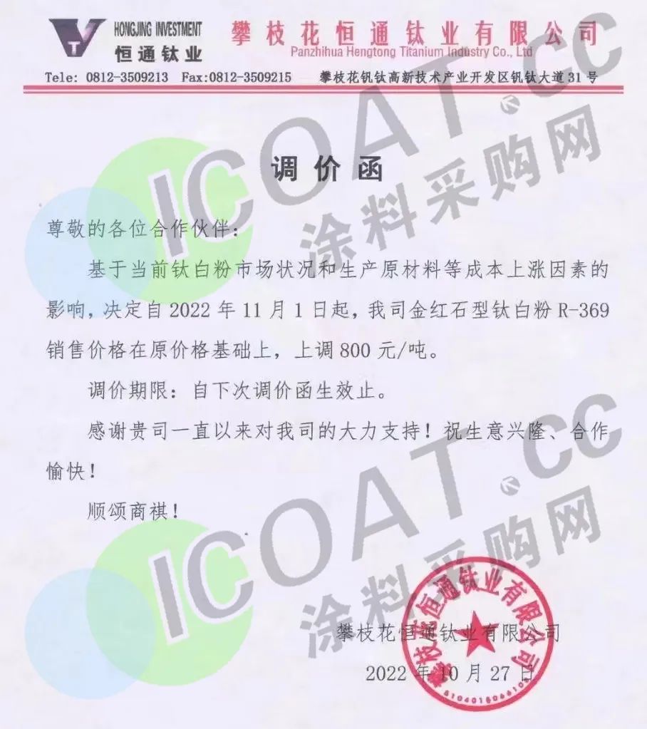 攀枝花恒通鈦業:11月1日起,金紅石型鈦白粉R-369銷售價格在原價格基礎上上調800元/噸。
