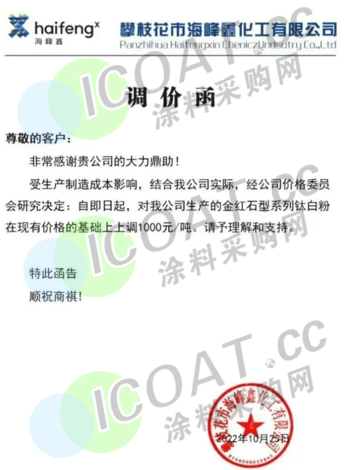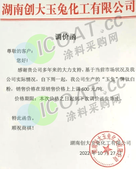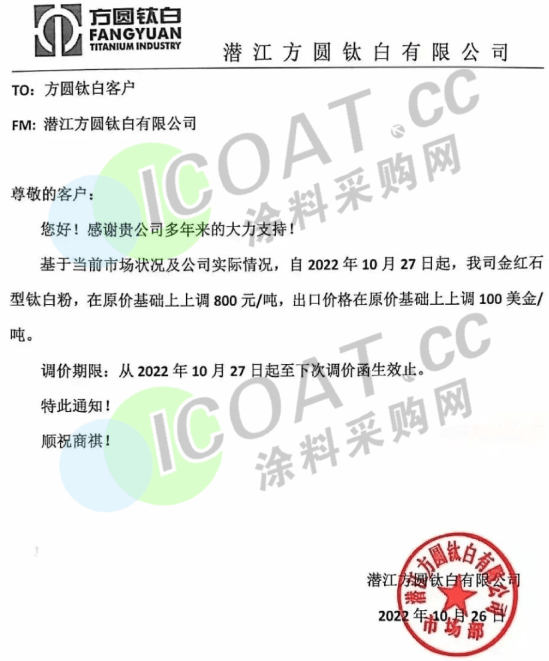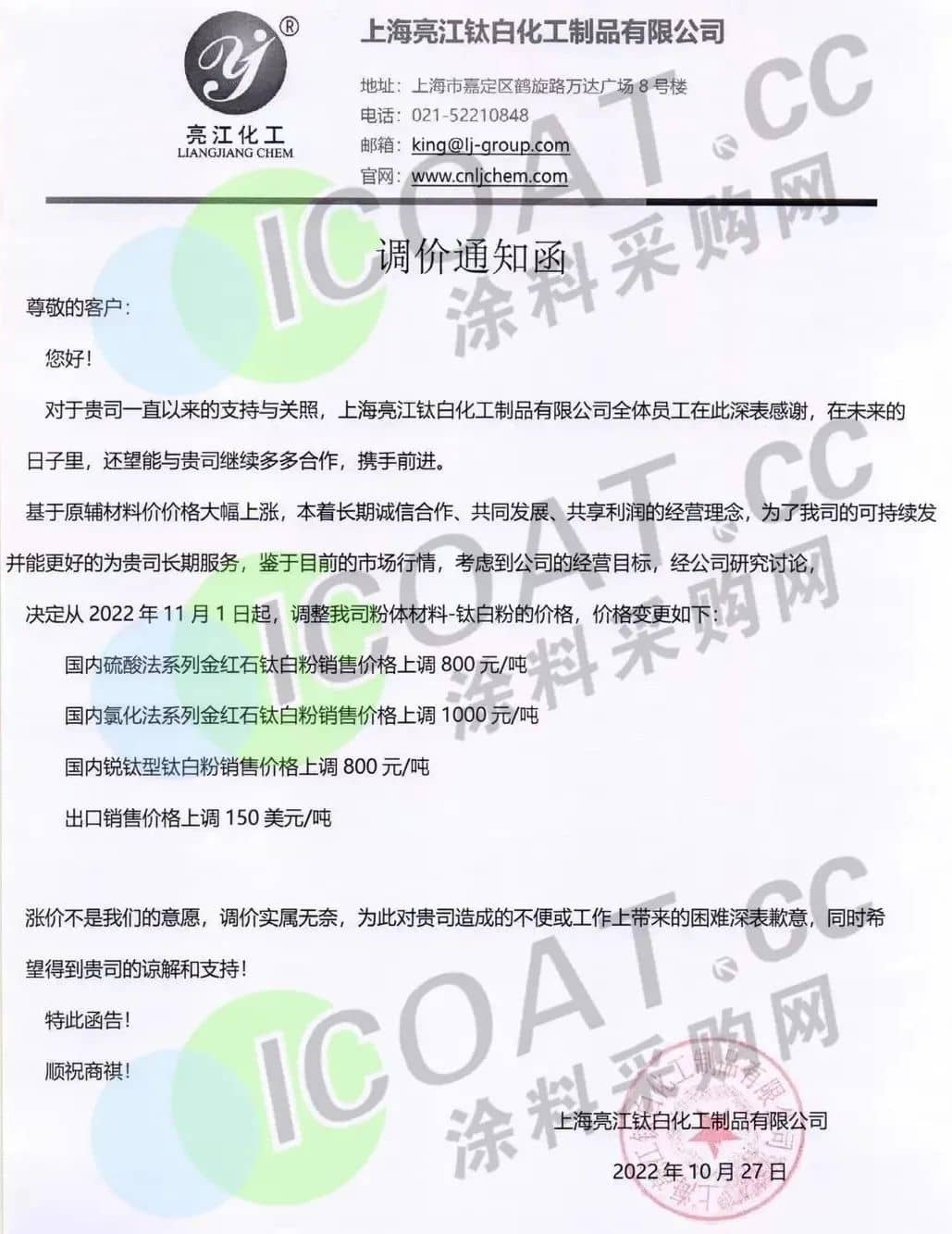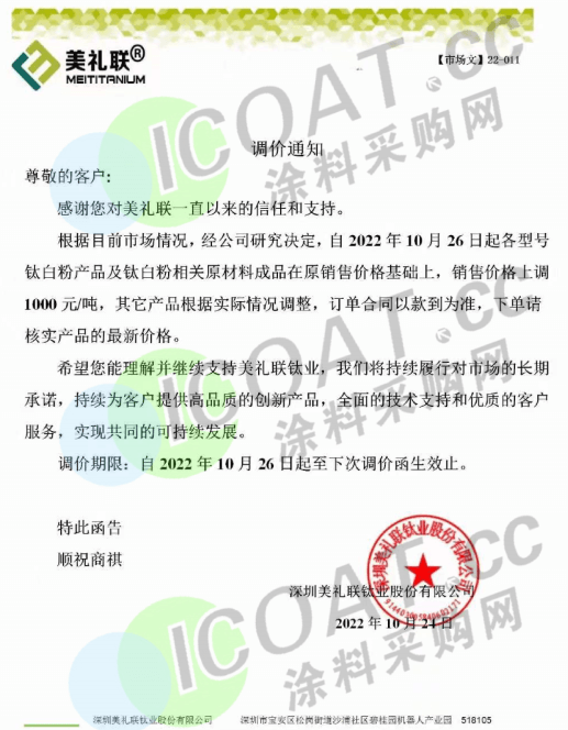 美禮聯鈦業:自10月26日起,各型號鈦白粉產品及鈦白粉相關原材料成品在原銷售價格基礎上上調1000元/噸。
