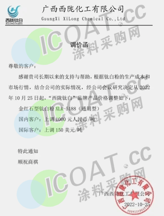 廣西西隴化工:10月25日起,“西隴鈦白"品牌產品價格調整如下:金紅石型鈦白粉XLR-5188(通用型)國內客戶上調1000元人民幣/噸,國際客戶上調150美元/噸。