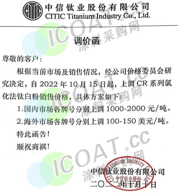 中信鈦業:自2022年10月15日起,國內市場各牌號CR系列氯化法鈦白粉銷售價格上調1000-2000元/噸,海外市場各牌號CR系列氯化法鈦白粉銷售價格上調100-150美元/噸。