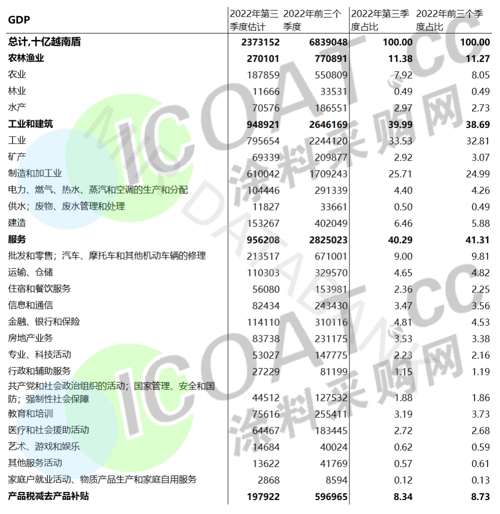 近日,越南國家統計局公布國民經濟統計報告,2022年第三季度,越南國內生產總值(GDP)為2373.152萬億越南盾(約7100億人民幣),同比增長13.76%,較二季度的7.7%再度提速。由于制造業和出口強勁以及基數較低,為數十年來最快增速。