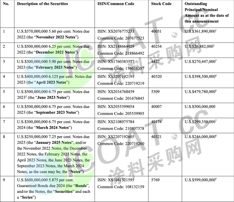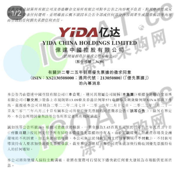 億達中國公告稱,根據同意征求的條款,一筆金額為345萬美元須于2022年9月30日按比例支付予所有屆時未償還優先票據(YIDCHL 6 03/27/22,ISIN:XS2130508000)的持有人。由于宏觀經濟、房地產市場及金融環境的不利因素,加上多波疫情爆發,億達中國無法于付款日期支付該筆款項,不付款可導致持有人要求加快就優先票據還款。