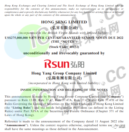 弘陽集團有限公司發布公告表示,預計不會在寬限期內,償付本應于8月27日到期的HONGSL 9.875 08/27/22的所有未償本金金額及其應計和未付利息(統稱“應付金額”)。根據票據條款,到期時未能支付該筆票據本金將構成票據項下的違約事件,到期日后30天寬限期內未能支付該筆票據的利息將構成票據的違約事件。