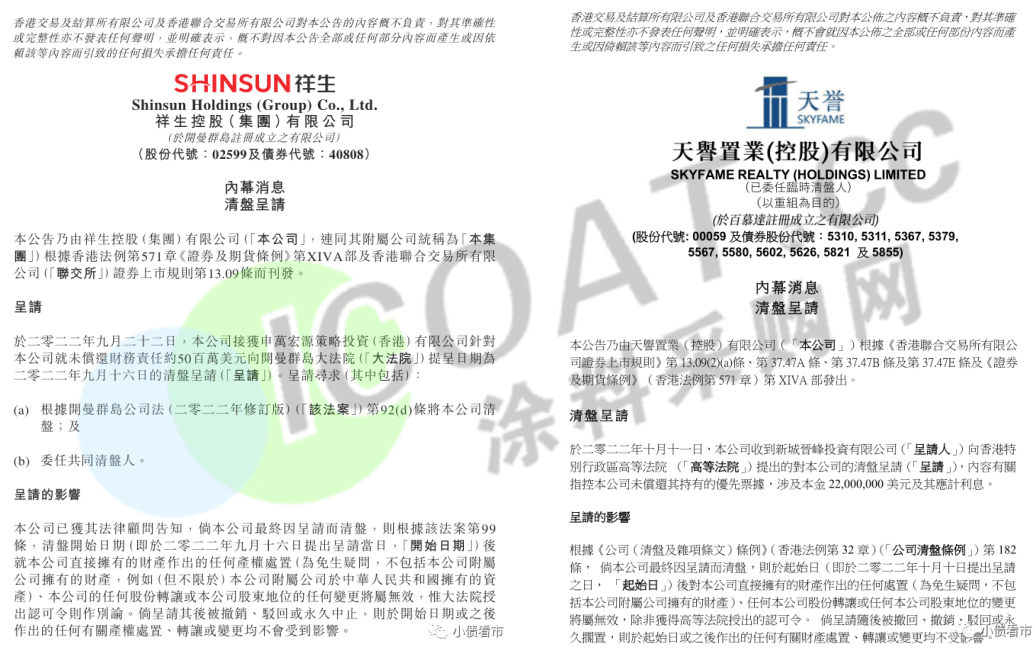 此外,由于發行的債權沒有如期兌換或者資不抵債等原因,融創中國、祥生控股集團、天譽置業、佳源國際控股、花樣年控股、中國恒大、新力控股、福晟國際等房企被呈請清盤。盡管大多數企業表示,將采取一切措施抗辯,但對于企業發展而言,被呈請清盤無疑是個利空的消息,預示著企業經營方面的風險。