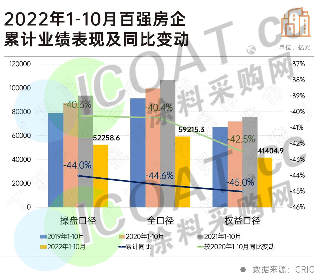 盡管政策暖風頻吹,但房地產市場復蘇緩慢。1-10月TOP100房企銷售操盤金額52258.6億元,同比降幅仍保持在44%的較高水平。