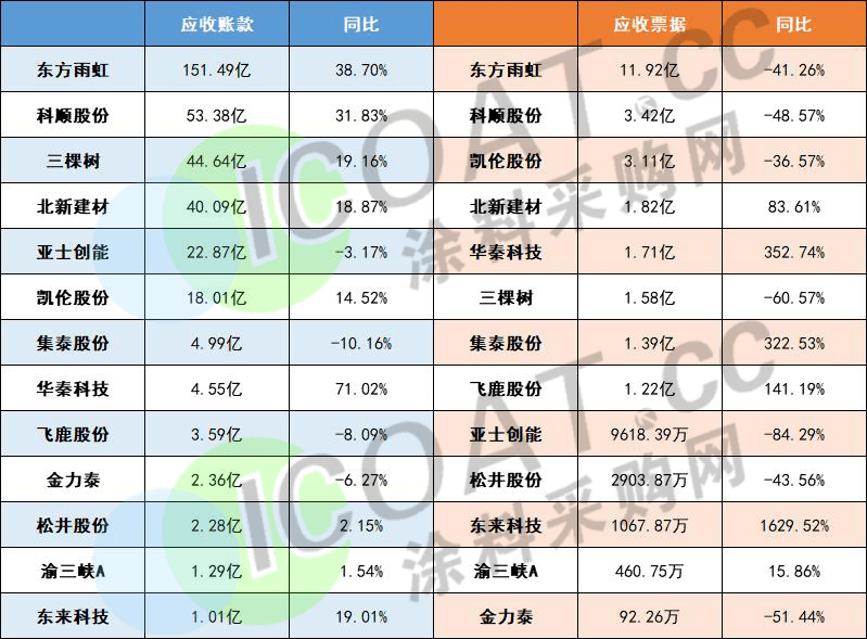 應收票據方面,東方雨虹為11.92億元,科順、凱倫超過3個億,北新建材、華秦科技、飛鹿股份等均在億元以上。