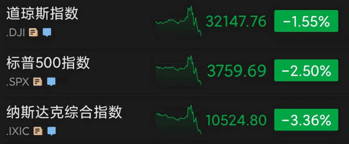 隨后美股三大指數(shù)集體跳水,截至收盤,道指跌505.44點,收于32147.76點,跌幅為1.55%,盤中一度漲超400點,收盤自高位回落超900點。標(biāo)普500指數(shù)下跌2.5%,收于3759.69點。納指下跌3.36%,報收于10524.80點。美股三大股指目前已連跌三日,標(biāo)普500指數(shù)創(chuàng)下10月7日來最大跌幅。