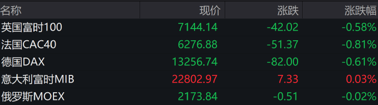 歐洲三大股指收盤同樣全線下跌,德國DAX指數(shù)跌0.61%報13256.74點,法國CAC40指數(shù)跌0.81%報6276.88點,英國富時100指數(shù)跌0.58%報7144.14點。