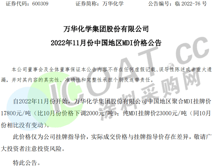 萬華化學(xué)近日公告,自2022年11月份開始,公司中國地區(qū)聚合MDI掛牌價17800元/噸,比10月份價格下調(diào)2000元/噸。