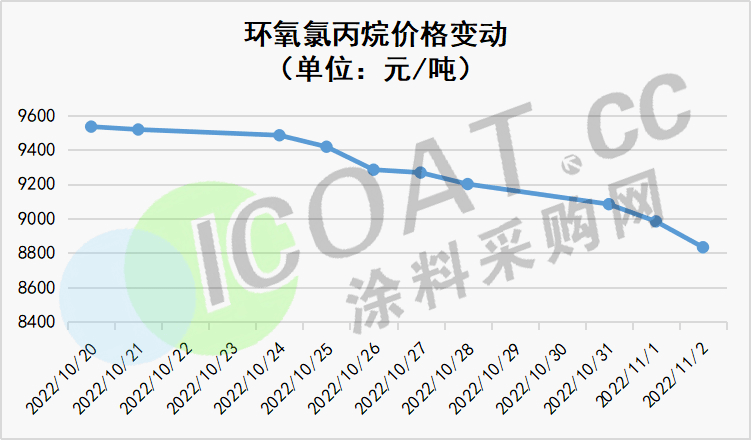 環(huán)氧氯丙烷從9533.34元/噸跌至8833.33元/噸,報價9連跌,累計下跌700.01元/噸,跌幅7.34%。