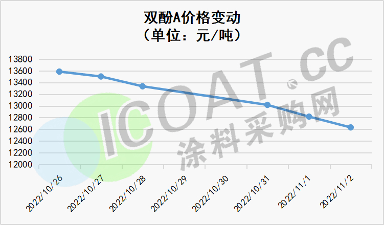 雙酚A從13583.33元/噸跌至12633.33元/噸,報價5連跌,累計下跌950元/噸,跌幅6.99%。