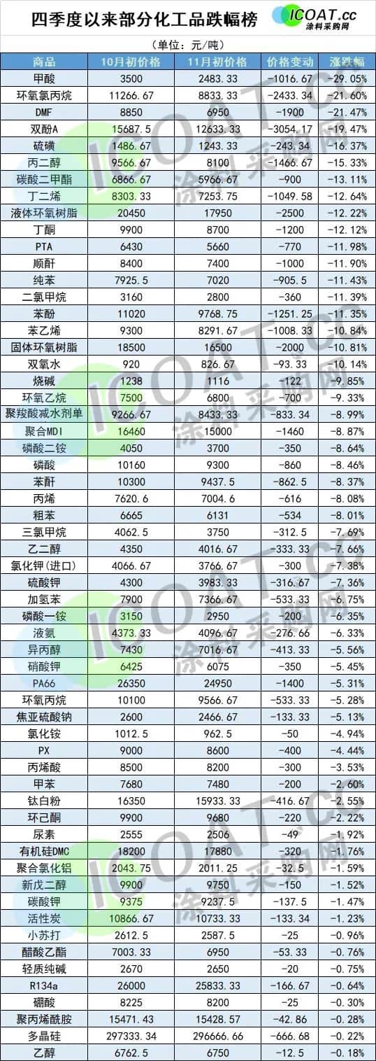 此外,四季度以來,60多種化工品報價下跌,甲酸、環(huán)氧氯丙烷、DMF等報價下滑近3成,雙酚A、硫磺、丙二醇等報價下調(diào)近2成,環(huán)氧樹脂、環(huán)氧氯丙烷、聚合MDI、苯乙烯等噸價下調(diào)超過千元。