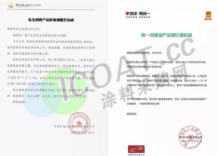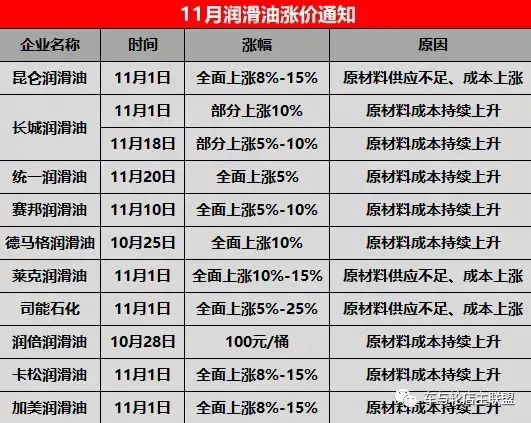 隨著原油高位持續上漲,潤滑油原材料基礎油、添加劑成本不斷上漲,物流運輸、包裝等運營費用增加,造成全鏈條成本大幅提高,包括長城、昆侖、統一、賽邦、德馬格、卡松等國內外潤滑油企業紛紛發函調漲,11月上漲幅度普遍在10%左右,最高漲幅達25%。