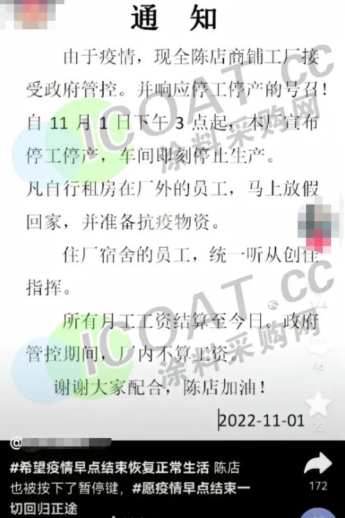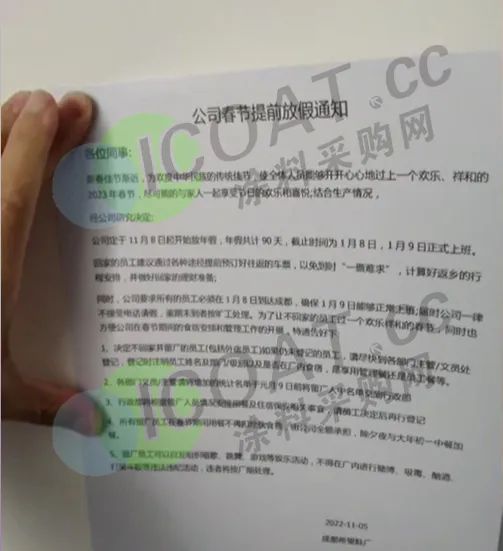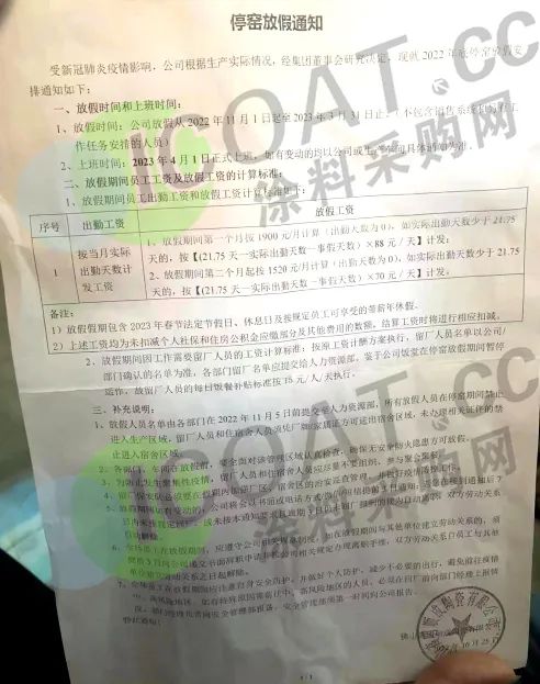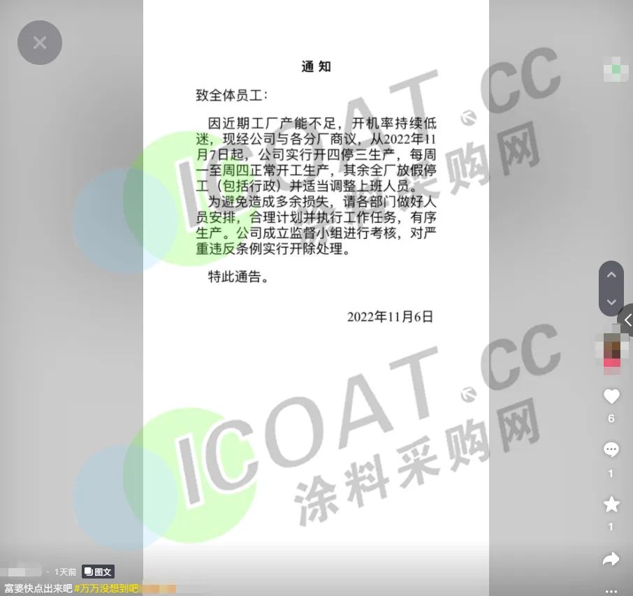 某網(wǎng)友表示,企業(yè)已經(jīng)通知員工,因工廠產能不足,開機率持續(xù)低迷,從2022年11月7日起,實行開四停三生產,每周一至周四正常開工生產,其余全廠放假停工(包括行政)。