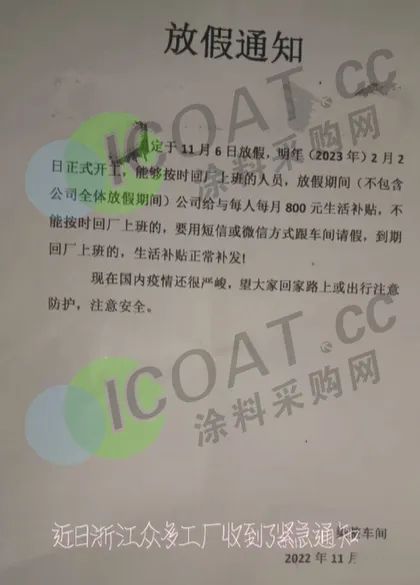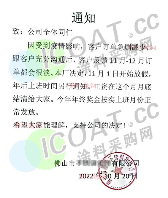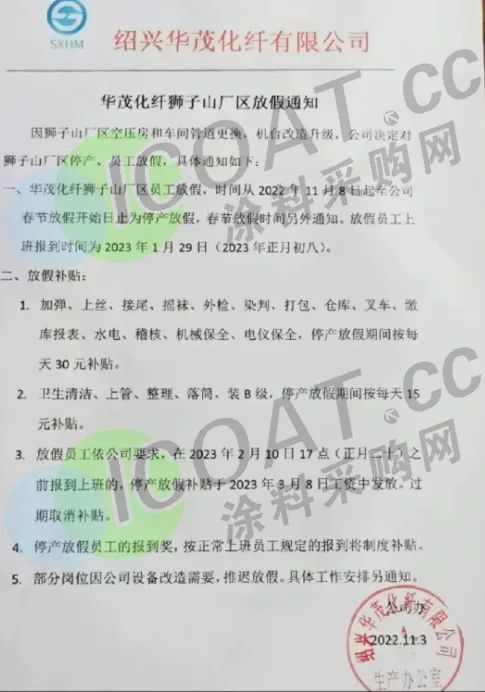 紹興華茂化纖有限公司:決定對獅子山廠區(qū)停產、員工放假,時間從2022年11月8日起,至春節(jié)放假開始日止為停產放假,放假員工上班報道時間為2023年1月29月(2023年正月初八),部分崗位每天給予15~30元補貼。
