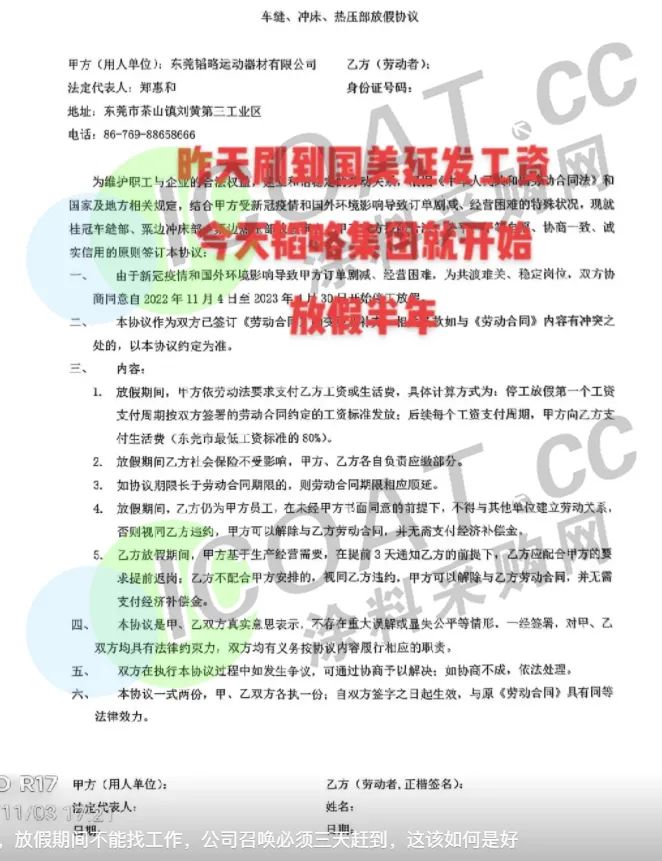 東莞某運動器材企業(yè):由于新冠疫情和國外環(huán)境影響導致訂單俱減,經(jīng)營困難,為共渡難關穩(wěn)定崗位,雙方協(xié)商同意自2022年11月4日至2023年1月30日開始停工放假。