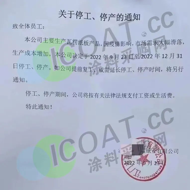 某紙業(yè)工廠:自9月23日至12月31日停工停產,期間企業(yè)將按有關法律法規(guī)支付工資或生活費。